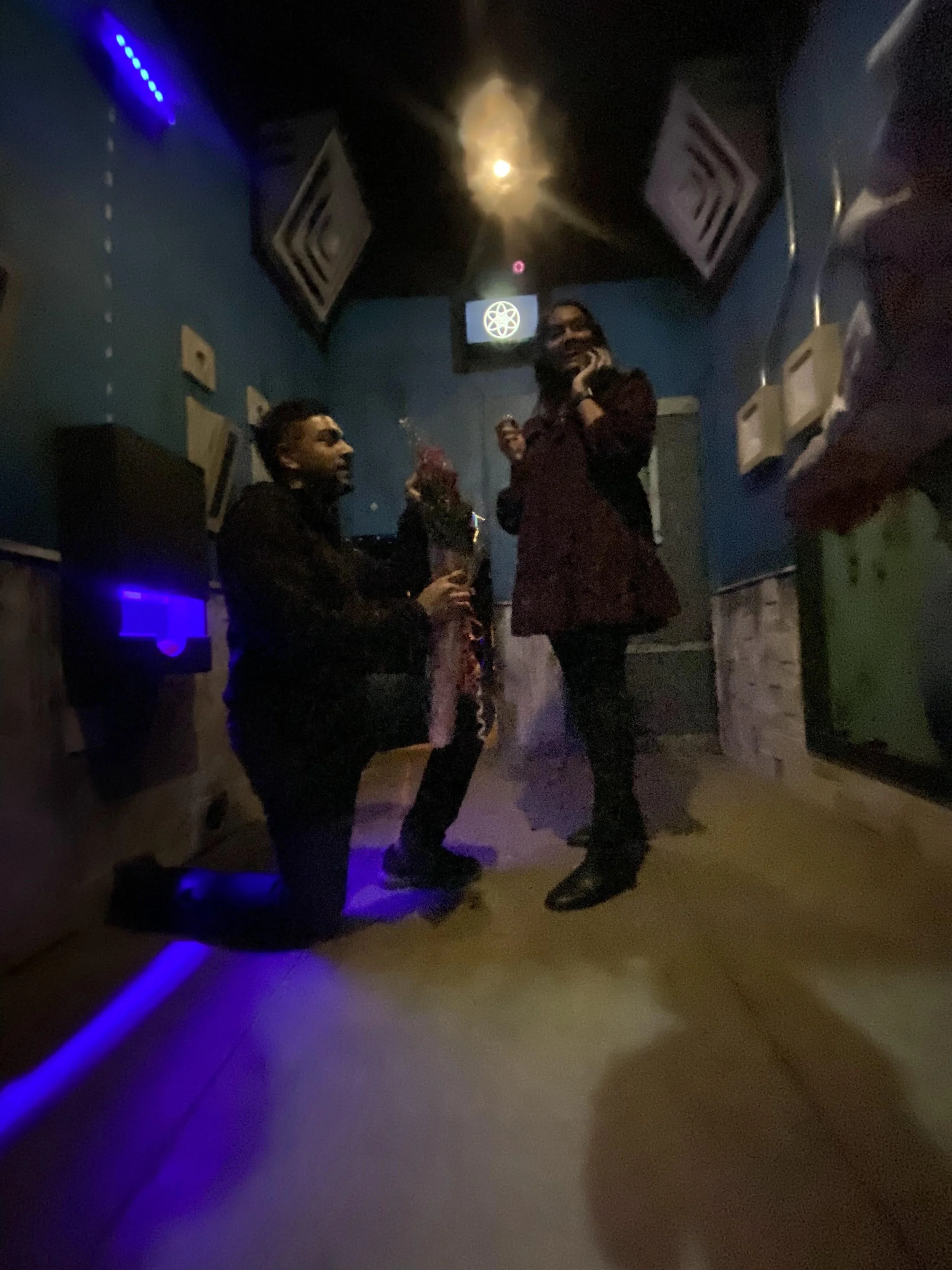 Rohan & I took a slightly different route and got engaged surrounded by fake blood stains on the wall and a dystopian voice over loudspeakers telling us time was running out. And it was just as special for us.